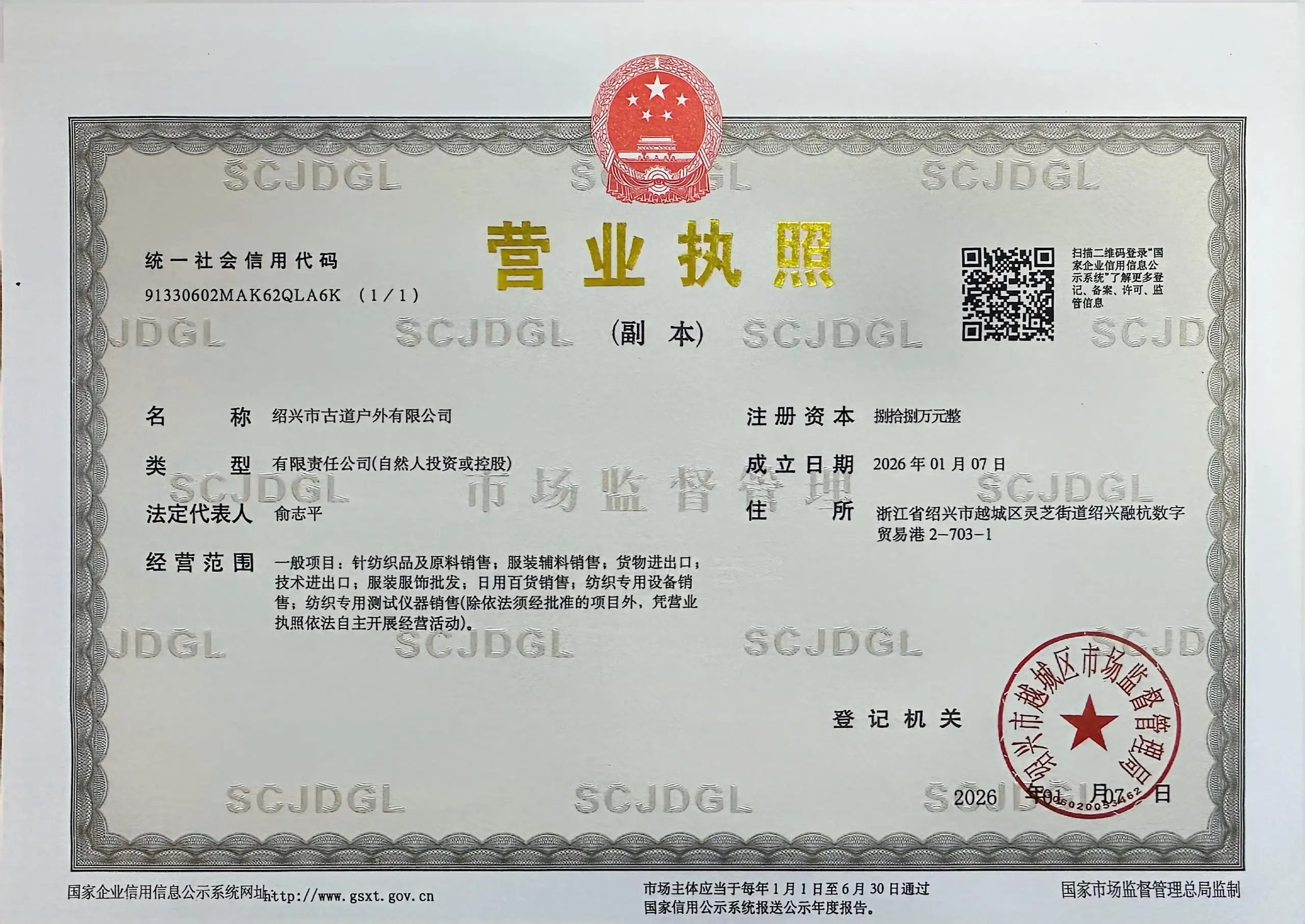 Registered address : 2-703-1, Shaoxing Ronghang Digital Trade Port, Lingzhi Street, Yuecheng District, Shaoxing City, Zhejiang Province Shaoxing Zhejiang China
